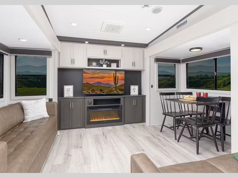 Sleeps 5 Slides 3 Length 33 ft 1 in Ext Height 12 ft 6 in Interior Color Hemp Hitch Weight 1500 lbs Dry Weight 9122 lbs Cargo Capacity 1878 lbs Fresh Water Capacity 54 gals Grey Water Capacity 60 gals Black Water Capacity 30 gals Tire Size ST225/75R15E Available Beds Queen Refrigerator Type 12V Solar Friendly Cooktop Burners 3 Shower Size 48" x 30" Number of Awnings 2 LP Tank Capacity 30 lbs Water Heater Type On Demand Tankless AC BTU 31500 btu TV Info LR TV Awning Info 10' & 14' Power w/Gas Strut Arm Axle Count 2 Number of LP Tanks 2 Shower Type Standard Electrical Service 50 amp Similar Floorplans