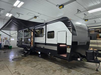 Hideout Max travel trailers by Keystone are built to make the most of every trip, with durable construction, a fully walkable roof with ladder prep, tinted safety glass windows, and solid step entry steps that make getting in and out easy. Standard features like a waterproof drop-frame pass-through for bulky gear, a power awning with LED lights, power stabilizer jacks, and a power tongue jack keep campsite setup simple, while the tankless water heater, SolarFlex™-ready wiring, and 26K dual A/C system on 30-amp service help every Hideout Max feel comfortable and capable, no matter which floorplan you choose.