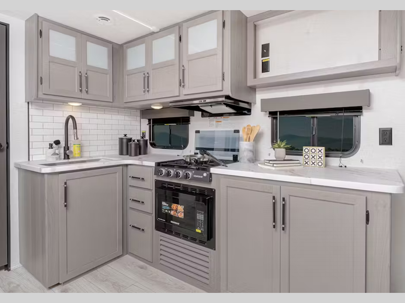 Inside, you'll enjoy blackout night shades, LED lighting, a stainless-steel sink, and pressed membrane premium countertops. The tankless water heater will provide endless hot showers and the 30k BTU furnace will help keep you warm on chilly evenings. Each model is also SolarFlex ready for off-grid capabilities, and there is Furrion backup camera prep for the option to make parking smoother.