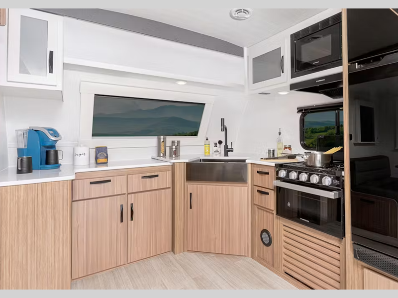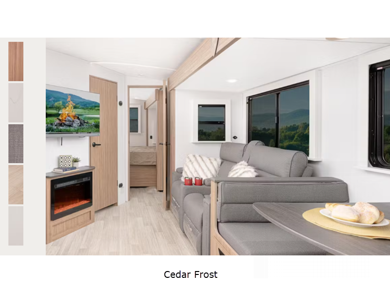 Each one is constructed with a seamless, laminated and gel-coated filon exterior, a fully walkable roof, and a high impact thermoset resin painted front cap for added protection. You'll love the residential and durable Beauflor vinyl flooring inside, along with Frosted Cedar woodgrain cabinetry and deluxe night shades. The exterior is just as accommodating with its outside shower, Edge View line lighting in the front and rear, plus power stabilizer jacks to name a few conveniences.